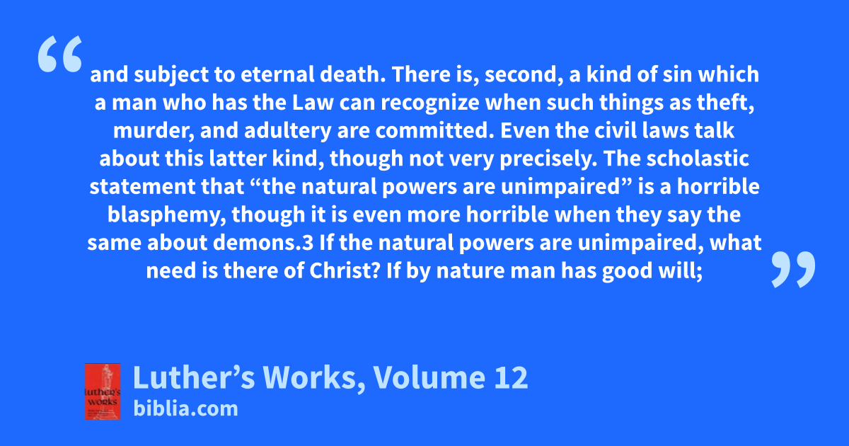 and subject to eternal death. There is, second, a kind of sin which a man who has the Law can recognize when such things as theft, murder, and adultery are committed. Even the civil laws talk about this latter kind, though not very precisely. The scholastic statement that “the natural powers are unimpaired” is a horrible blasphemy, though it is even more horrible when they say the same about demons.3 If the natural powers are unimpaired, what need is there of Christ? If by nature man has good will;