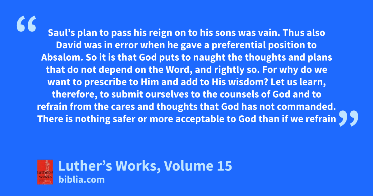 Saul’s plan to pass his reign on to his sons was vain. Thus also David was in error when he gave a preferential position to Absalom. So it is that God puts to naught the thoughts and plans that do not depend on the Word, and rightly so. For why do we want to prescribe to Him and add to His wisdom? Let us learn, therefore, to submit ourselves to the counsels of God and to refrain from the cares and thoughts that God has not commanded. There is nothing safer or more acceptable to God than if we refrain