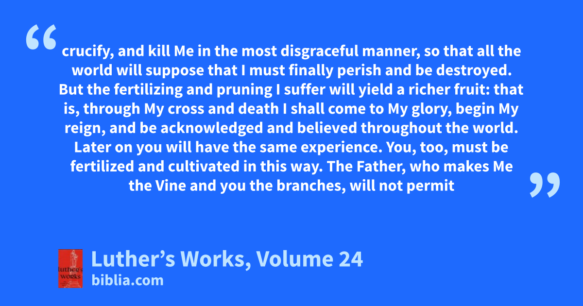 crucify, and kill Me in the most disgraceful manner, so that all the world will suppose that I must finally perish and be destroyed. But the fertilizing and pruning I suffer will yield a richer fruit: that is, through My cross and death I shall come to My glory, begin My reign, and be acknowledged and believed throughout the world. Later on you will have the same experience. You, too, must be fertilized and cultivated in this way. The Father, who makes Me the Vine and you the branches, will not permit