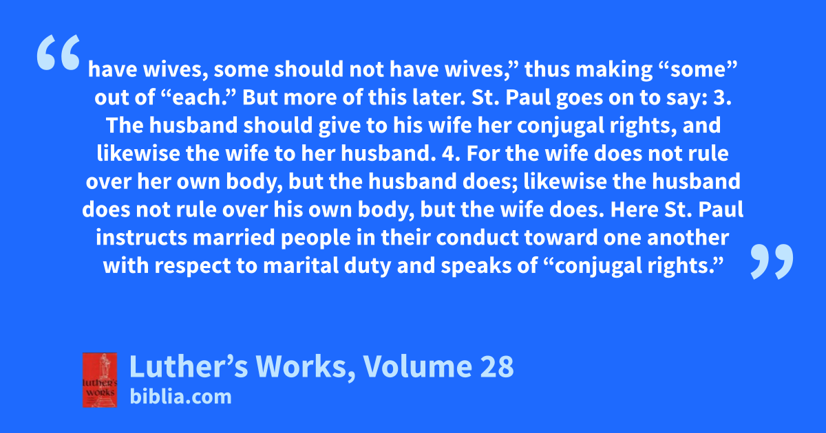 have wives, some should not have wives,” thus making “some” out of “each.” But more of this later. St. Paul goes on to say: 3. The husband should give to his wife her conjugal rights, and likewise the wife to her husband. 4. For the wife does not rule over her own body, but the husband does; likewise the husband does not rule over his own body, but the wife does. Here St. Paul instructs married people in their conduct toward one another with respect to marital duty and speaks of “conjugal rights.”