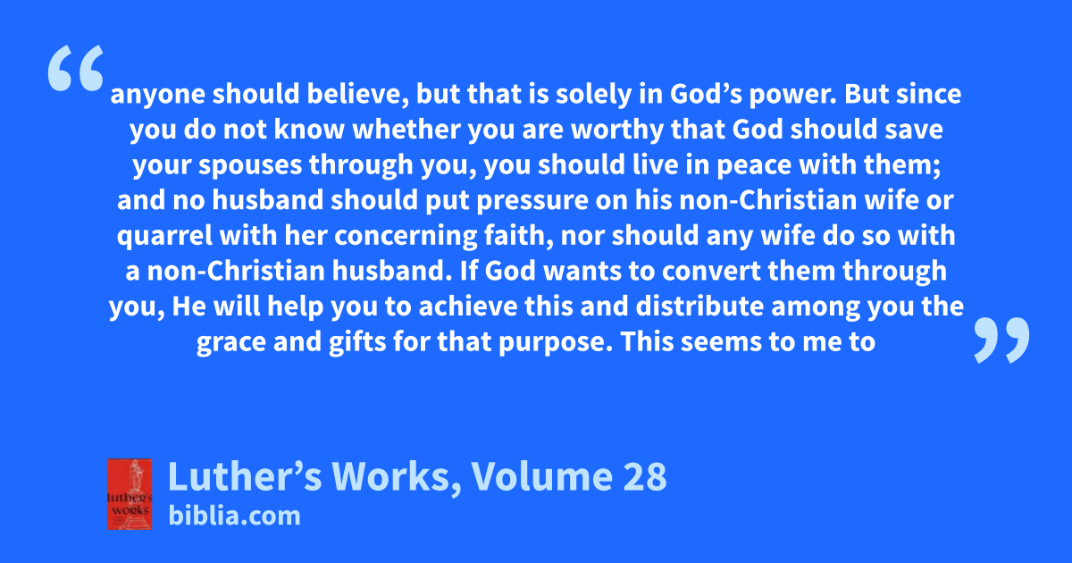 anyone should believe, but that is solely in God’s power. But since you do not know whether you are worthy that God should save your spouses through you, you should live in peace with them; and no husband should put pressure on his non-Christian wife or quarrel with her concerning faith, nor should any wife do so with a non-Christian husband. If God wants to convert them through you, He will help you to achieve this and distribute among you the grace and gifts for that purpose. This seems to me to