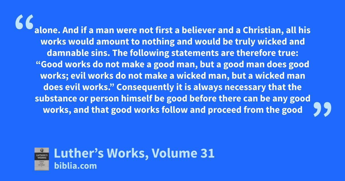 alone. And if a man were not first a believer and a Christian, all his works would amount to nothing and would be truly wicked and damnable sins. The following statements are therefore true: “Good works do not make a good man, but a good man does good works; evil works do not make a wicked man, but a wicked man does evil works.” Consequently it is always necessary that the substance or person himself be good before there can be any good works, and that good works follow and proceed from the good