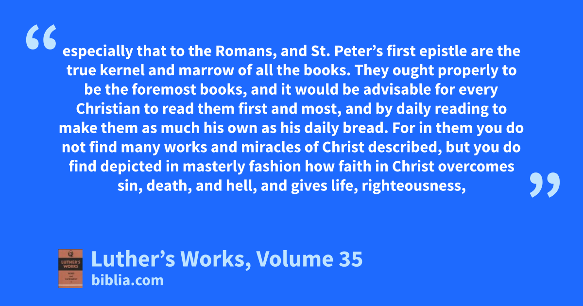 especially that to the Romans, and St. Peter’s first epistle are the true kernel and marrow of all the books. They ought properly to be the foremost books, and it would be advisable for every Christian to read them first and most, and by daily reading to make them as much his own as his daily bread. For in them you do not find many works and miracles of Christ described, but you do find depicted in masterly fashion how faith in Christ overcomes sin, death, and hell, and gives life, righteousness,