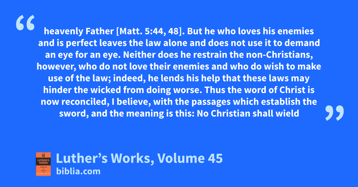 heavenly Father [Matt. 5:44, 48]. But he who loves his enemies and is perfect leaves the law alone and does not use it to demand an eye for an eye. Neither does he restrain the non-Christians, however, who do not love their enemies and who do wish to make use of the law; indeed, he lends his help that these laws may hinder the wicked from doing worse. Thus the word of Christ is now reconciled, I believe, with the passages which establish the sword, and the meaning is this: No Christian shall wield