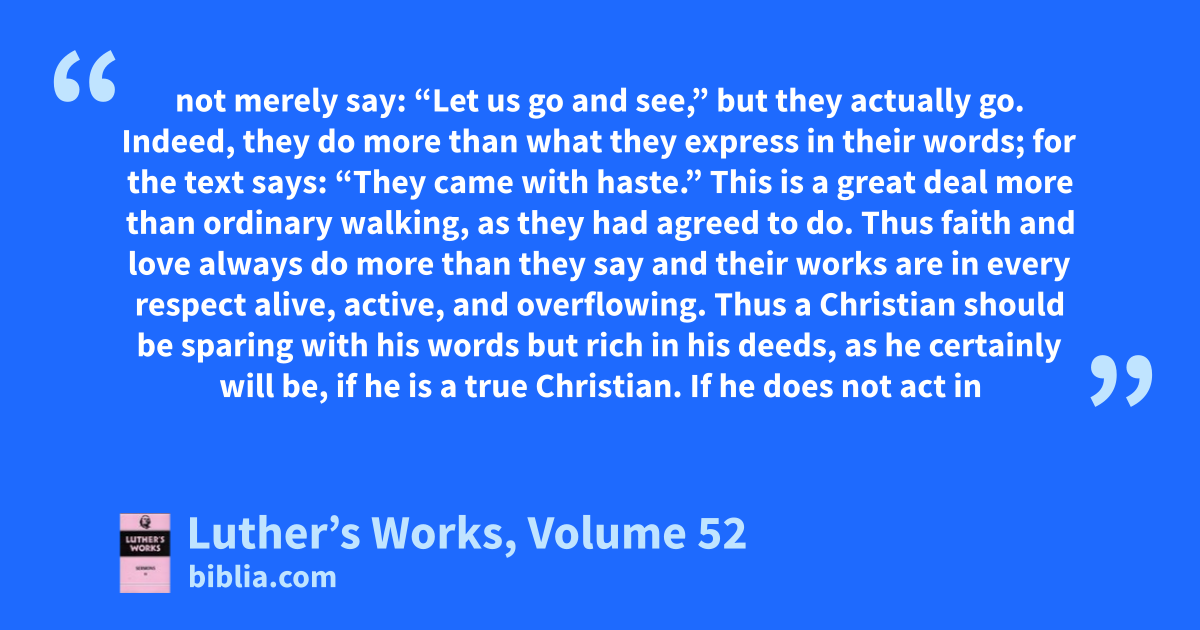 not merely say: “Let us go and see,” but they actually go. Indeed, they do more than what they express in their words; for the text says: “They came with haste.” This is a great deal more than ordinary walking, as they had agreed to do. Thus faith and love always do more than they say and their works are in every respect alive, active, and overflowing. Thus a Christian should be sparing with his words but rich in his deeds, as he certainly will be, if he is a true Christian. If he does not act in