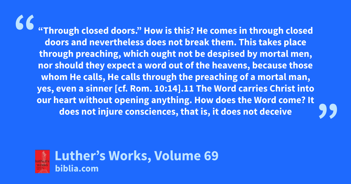 “Through closed doors.” How is this? He comes in through closed doors and nevertheless does not break them. This takes place through preaching, which ought not be despised by mortal men, nor should they expect a word out of the heavens, because those whom He calls, He calls through the preaching of a mortal man, yes, even a sinner [cf. Rom. 10:14].11 The Word carries Christ into our heart without opening anything. How does the Word come? It does not injure consciences, that is, it does not deceive