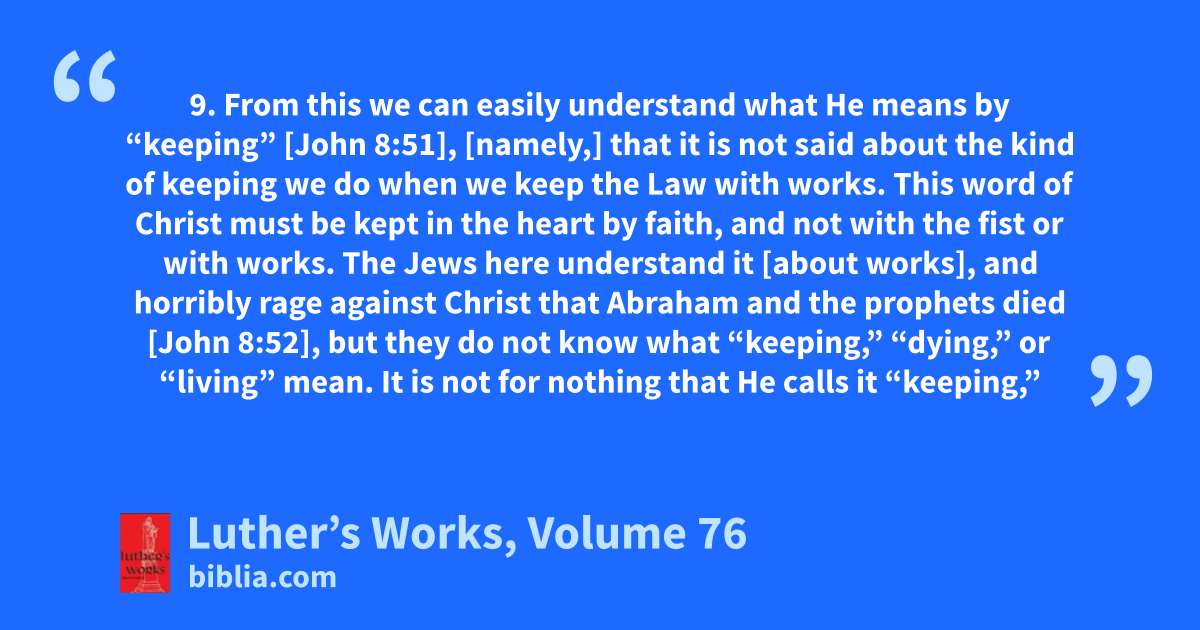 9. From this we can easily understand what He means by “keeping” [John 8:51], [namely,] that it is not said about the kind of keeping we do when we keep the Law with works. This word of Christ must be kept in the heart by faith, and not with the fist or with works. The Jews here understand it [about works], and horribly rage against Christ that Abraham and the prophets died [John 8:52], but they do not know what “keeping,” “dying,” or “living” mean. It is not for nothing that He calls it “keeping,”