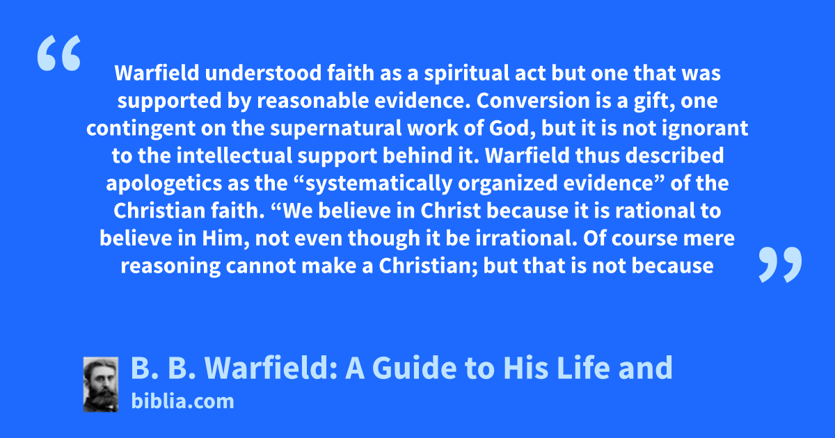 Warfield understood faith as a spiritual act but one that was supported by reasonable evidence. Conversion is a gift, one contingent on the supernatural work of God, but it is not ignorant to the intellectual support behind it. Warfield thus described apologetics as the “systematically organized evidence” of the Christian faith. “We believe in Christ because it is rational to believe in Him, not even though it be irrational. Of course mere reasoning cannot make a Christian; but that is not because