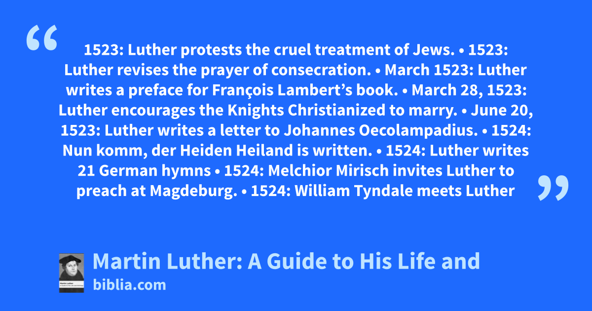 1523: Luther protests the cruel treatment of Jews. • 1523: Luther revises the prayer of consecration. • March 1523: Luther writes a preface for François Lambert’s book. • March 28, 1523: Luther encourages the Knights Christianized to marry. • June 20, 1523: Luther writes a letter to Johannes Oecolampadius. • 1524: Nun komm, der Heiden Heiland is written. • 1524: Luther writes 21 German hymns • 1524: Melchior Mirisch invites Luther to preach at Magdeburg. • 1524: William Tyndale meets Luther