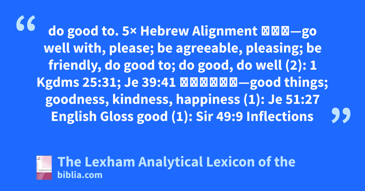 do good to. 5× Hebrew Alignment יטב—go well with, please; be agreeable, pleasing; be friendly, do good to; do good, do well (2): 1 Kgdms 25:31; Je 39:41 טוֹבָה—good things; goodness, kindness, happiness (1): Je 51:27 English Gloss good (1): Sir 49:9 Inflections