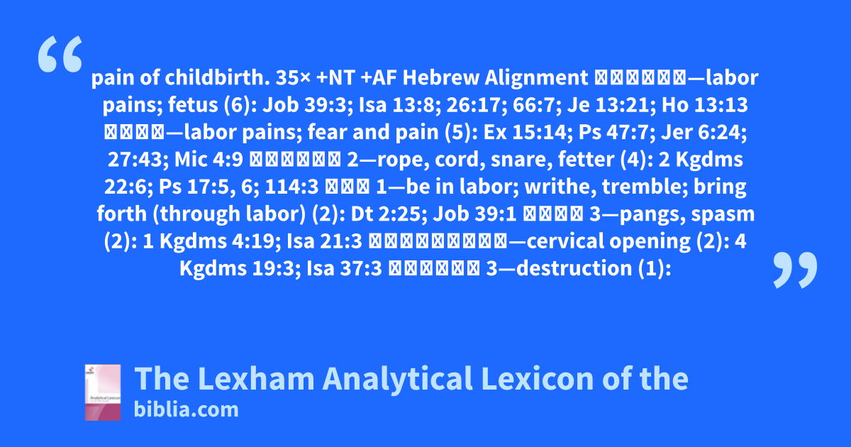 pain of childbirth. 35× +NT +AF Hebrew Alignment חֵ֫בֶל—labor pains; fetus (6): Job 39:3; Isa 13:8; 26:17; 66:7; Je 13:21; Ho 13:13 חִיל—labor pains; fear and pain (5): Ex 15:14; Ps 47:7; Jer 6:24; 27:43; Mic 4:9 חֶ֫בֶל 2—rope, cord, snare, fetter (4): 2 Kgdms 22:6; Ps 17:5, 6; 114:3 חיל 1—be in labor; writhe, tremble; bring forth (through labor) (2): Dt 2:25; Job 39:1 צִיר 3—pangs, spasm (2): 1 Kgdms 4:19; Isa 21:3 מַשְׁבֵּר—cervical opening (2): 4 Kgdms 19:3; Isa 37:3 חֶ֫בֶל 3—destruction (1):