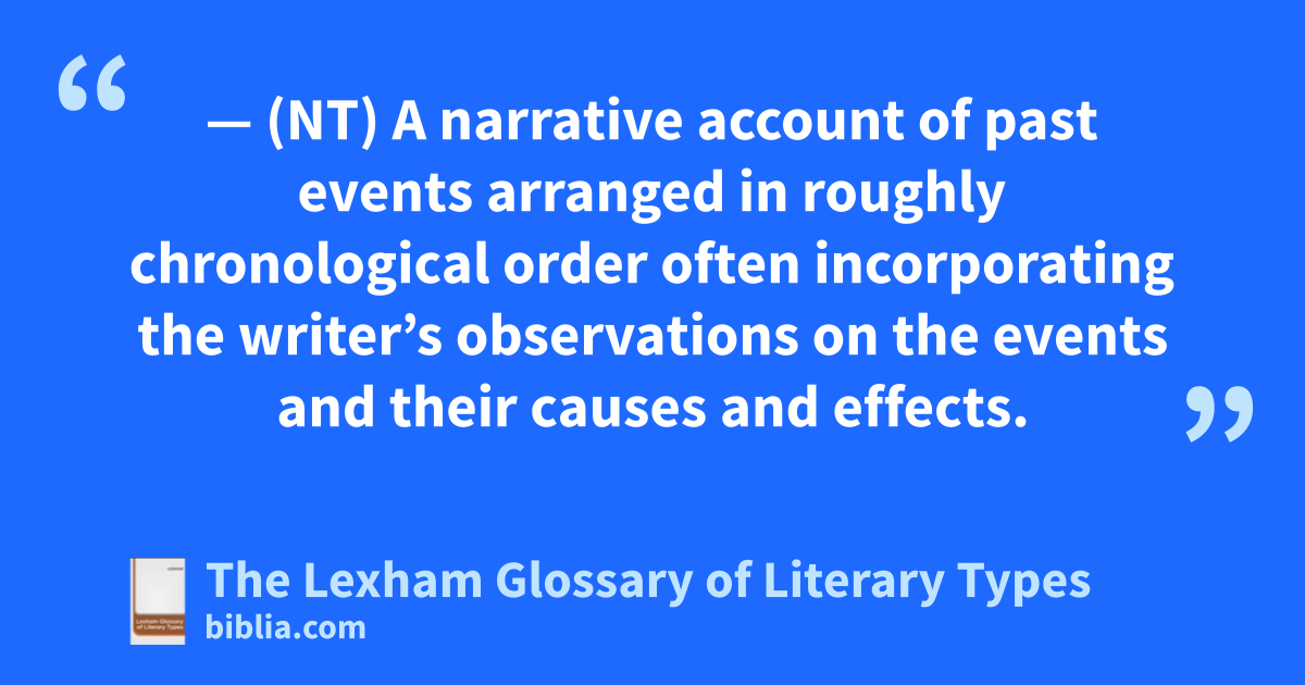 — (NT) A narrative account of past events arranged in roughly chronological order often incorporating the writer’s observations on the events and their causes and effects.