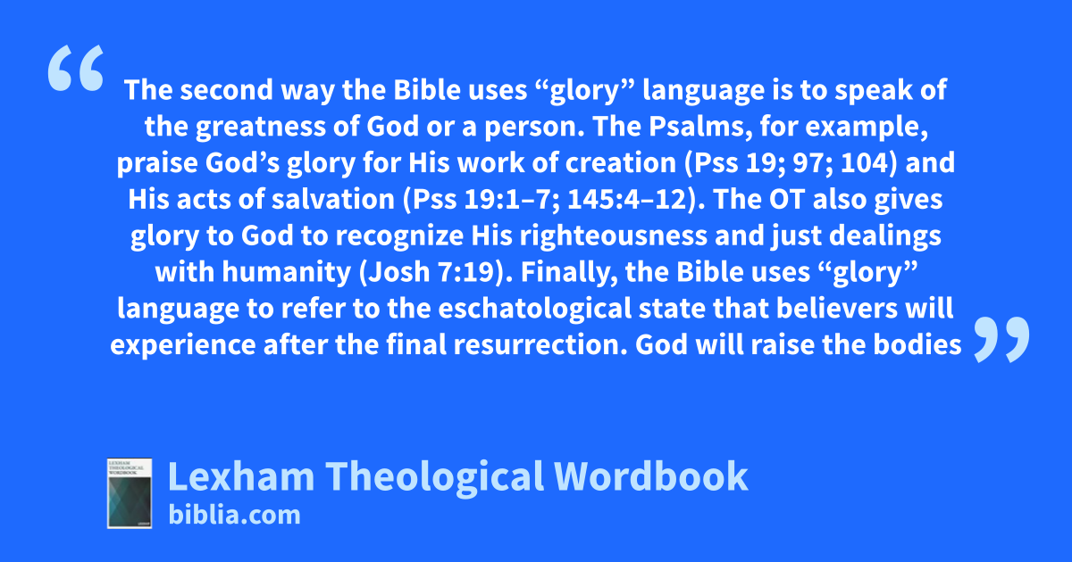 The second way the Bible uses “glory” language is to speak of the greatness of God or a person. The Psalms, for example, praise God’s glory for His work of creation (Pss 19; 97; 104) and His acts of salvation (Pss 19:1–7; 145:4–12). The OT also gives glory to God to recognize His righteousness and just dealings with humanity (Josh 7:19). Finally, the Bible uses “glory” language to refer to the eschatological state that believers will experience after the final resurrection. God will raise the bodies