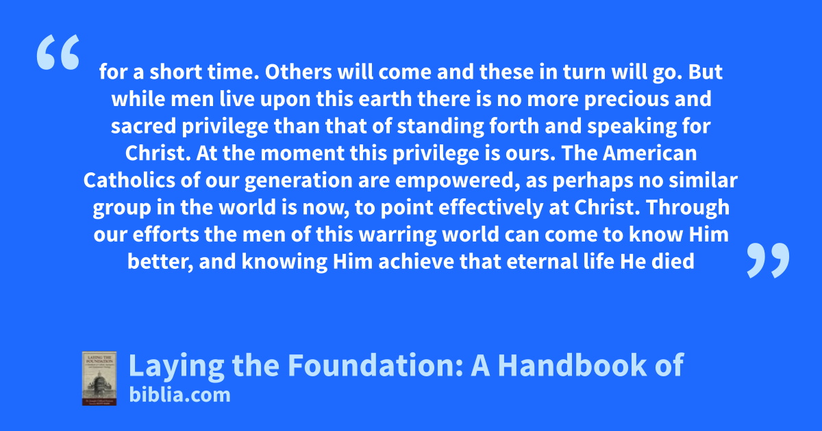for a short time. Others will come and these in turn will go. But while men live upon this earth there is no more precious and sacred privilege than that of standing forth and speaking for Christ. At the moment this privilege is ours. The American Catholics of our generation are empowered, as perhaps no similar group in the world is now, to point effectively at Christ. Through our efforts the men of this warring world can come to know Him better, and knowing Him achieve that eternal life He died