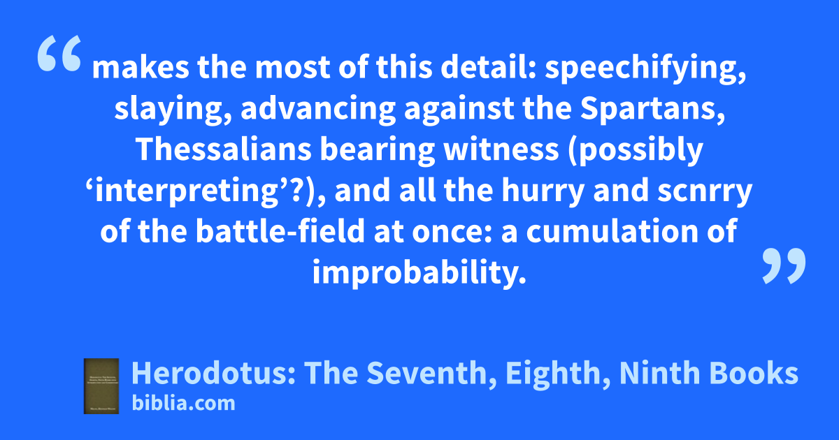 makes the most of this detail: speechifying, slaying, advancing against the Spartans, Thessalians bearing witness (possibly ‘interpreting’?), and all the hurry and scnrry of the battle-field at once: a cumulation of improbability.