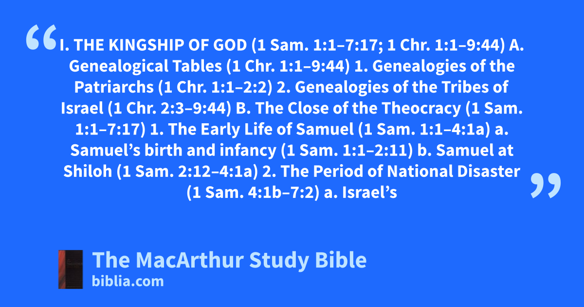 I. THE KINGSHIP OF GOD (1 Sam. 1:1–7:17; 1 Chr. 1:1–9:44) A. Genealogical Tables (1 Chr. 1:1–9:44) 1. Genealogies of the Patriarchs (1 Chr. 1:1–2:2) 2. Genealogies of the Tribes of Israel (1 Chr. 2:3–9:44) B. The Close of the Theocracy (1 Sam. 1:1–7:17) 1. The Early Life of Samuel (1 Sam. 1:1–4:1a) a. Samuel’s birth and infancy (1 Sam. 1:1–2:11) b. Samuel at Shiloh (1 Sam. 2:12–4:1a) 2. The Period of National Disaster (1 Sam. 4:1b–7:2) a. Israel’s
