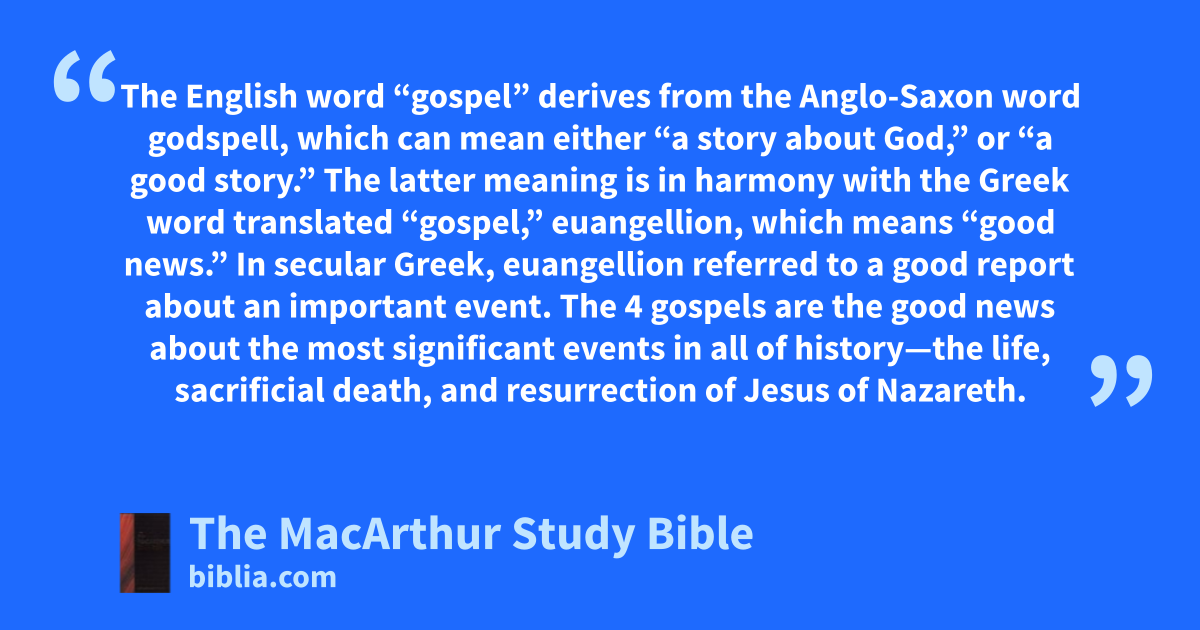 The English word “gospel” derives from the Anglo-Saxon word godspell, which can mean either “a story about God,” or “a good story.” The latter meaning is in harmony with the Greek word translated “gospel,” euangellion, which means “good news.” In secular Greek, euangellion referred to a good report about an important event. The 4 gospels are the good news about the most significant events in all of history—the life, sacrificial death, and resurrection of Jesus of Nazareth.