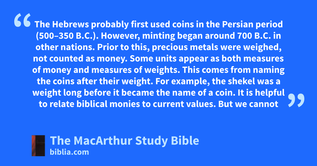 The Hebrews probably first used coins in the Persian period (500–350 B.C.). However, minting began around 700 B.C. in other nations. Prior to this, precious metals were weighed, not counted as money. Some units appear as both measures of money and measures of weights. This comes from naming the coins after their weight. For example, the shekel was a weight long before it became the name of a coin. It is helpful to relate biblical monies to current values. But we cannot