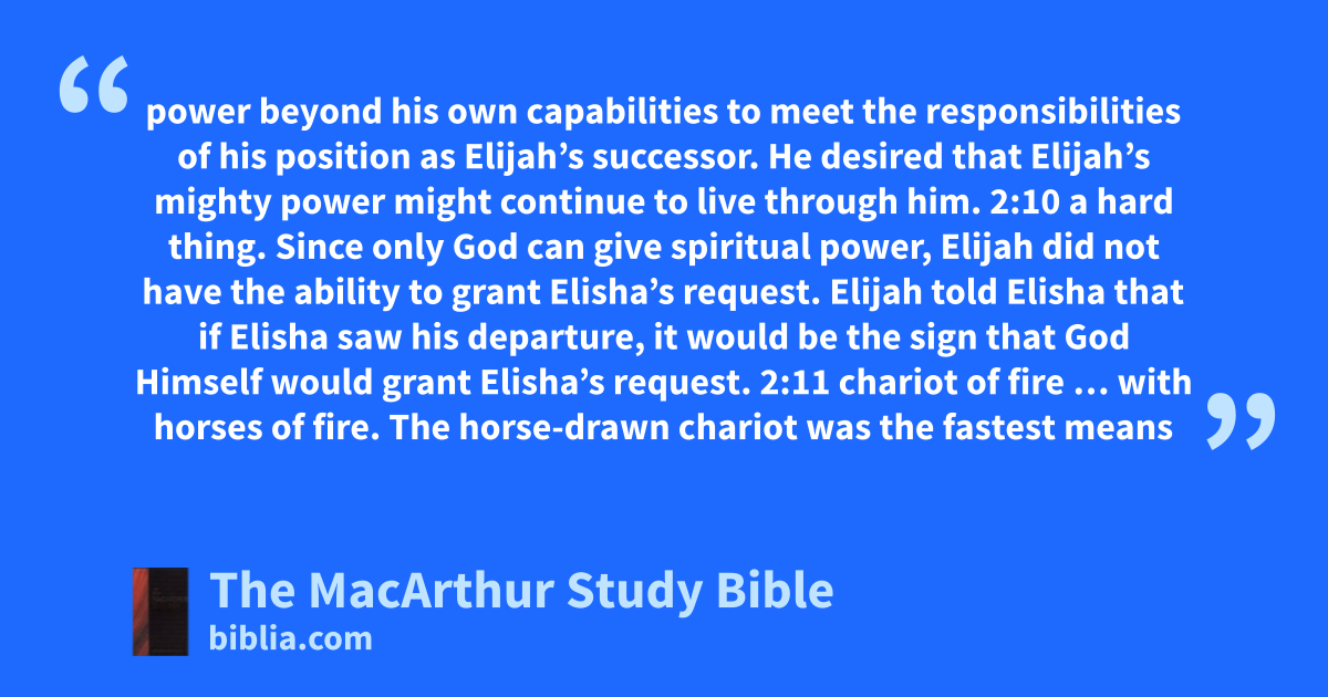 power beyond his own capabilities to meet the responsibilities of his position as Elijah’s successor. He desired that Elijah’s mighty power might continue to live through him. 2:10 a hard thing. Since only God can give spiritual power, Elijah did not have the ability to grant Elisha’s request. Elijah told Elisha that if Elisha saw his departure, it would be the sign that God Himself would grant Elisha’s request. 2:11 chariot of fire … with horses of fire. The horse-drawn chariot was the fastest means