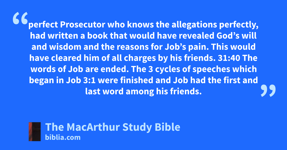 perfect Prosecutor who knows the allegations perfectly, had written a book that would have revealed God’s will and wisdom and the reasons for Job’s pain. This would have cleared him of all charges by his friends. 31:40 The words of Job are ended. The 3 cycles of speeches which began in Job 3:1 were finished and Job had the first and last word among his friends.