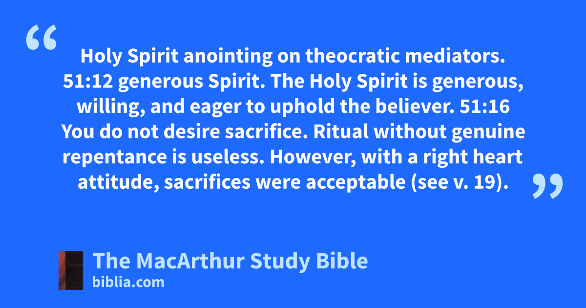 Holy Spirit anointing on theocratic mediators. 51:12 generous Spirit. The Holy Spirit is generous, willing, and eager to uphold the believer. 51:16 You do not desire sacrifice. Ritual without genuine repentance is useless. However, with a right heart attitude, sacrifices were acceptable (see v. 19).