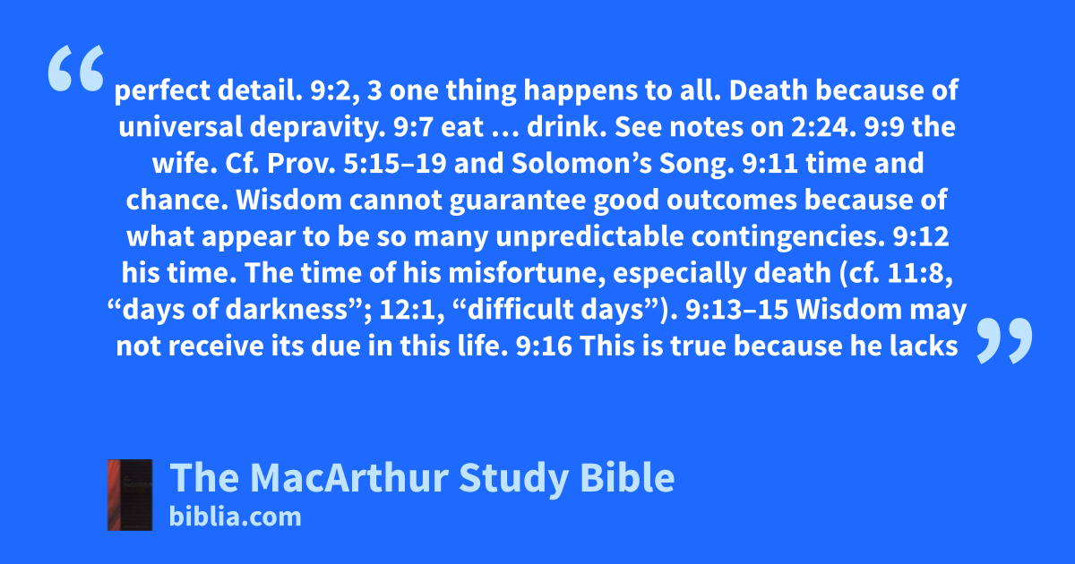 perfect detail. 9:2, 3 one thing happens to all. Death because of universal depravity. 9:7 eat … drink. See notes on 2:24. 9:9 the wife. Cf. Prov. 5:15–19 and Solomon’s Song. 9:11 time and chance. Wisdom cannot guarantee good outcomes because of what appear to be so many unpredictable contingencies. 9:12 his time. The time of his misfortune, especially death (cf. 11:8, “days of darkness”; 12:1, “difficult days”). 9:13–15 Wisdom may not receive its due in this life. 9:16 This is true because he lacks