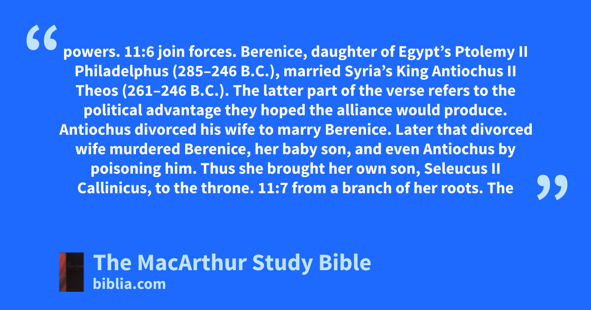 powers. 11:6 join forces. Berenice, daughter of Egypt’s Ptolemy II Philadelphus (285–246 B.C.), married Syria’s King Antiochus II Theos (261–246 B.C.). The latter part of the verse refers to the political advantage they hoped the alliance would produce. Antiochus divorced his wife to marry Berenice. Later that divorced wife murdered Berenice, her baby son, and even Antiochus by poisoning him. Thus she brought her own son, Seleucus II Callinicus, to the throne. 11:7 from a branch of her roots. The