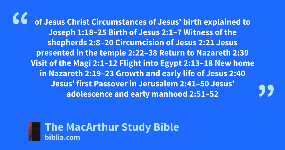 of Jesus Christ Circumstances of Jesus’ birth explained to Joseph 1:18–25 Birth of Jesus 2:1–7 Witness of the shepherds 2:8–20 Circumcision of Jesus 2:21 Jesus presented in the temple 2:22–38 Return to Nazareth 2:39 Visit of the Magi 2:1–12 Flight into Egypt 2:13–18 New home in Nazareth 2:19–23 Growth and early life of Jesus 2:40 Jesus’ first Passover in Jerusalem 2:41–50 Jesus’ adolescence and early manhood 2:51–52