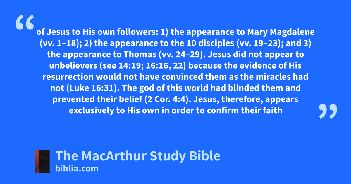 of Jesus to His own followers: 1) the appearance to Mary Magdalene (vv. 1–18); 2) the appearance to the 10 disciples (vv. 19–23); and 3) the appearance to Thomas (vv. 24–29). Jesus did not appear to unbelievers (see 14:19; 16:16, 22) because the evidence of His resurrection would not have convinced them as the miracles had not (Luke 16:31). The god of this world had blinded them and prevented their belief (2 Cor. 4:4). Jesus, therefore, appears exclusively to His own in order to confirm their faith