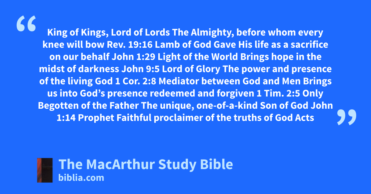King of Kings, Lord of Lords The Almighty, before whom every knee will bow Rev. 19:16 Lamb of God Gave His life as a sacrifice on our behalf John 1:29 Light of the World Brings hope in the midst of darkness John 9:5 Lord of Glory The power and presence of the living God 1 Cor. 2:8 Mediator between God and Men Brings us into God’s presence redeemed and forgiven 1 Tim. 2:5 Only Begotten of the Father The unique, one-of-a-kind Son of God John 1:14 Prophet Faithful proclaimer of the truths of God Acts