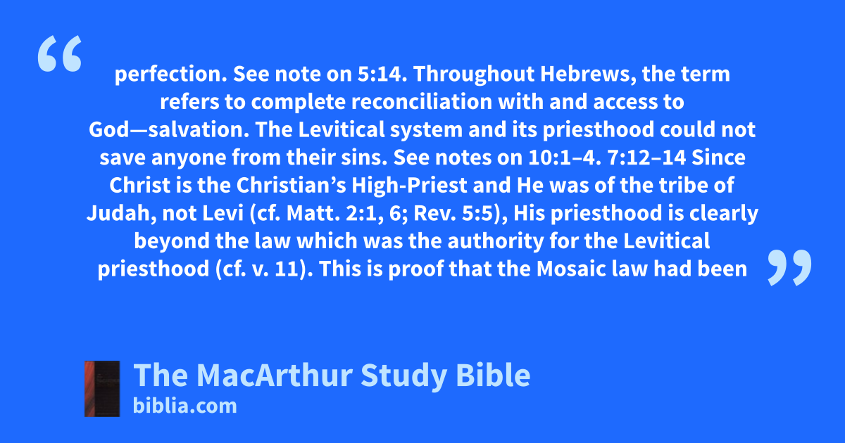 perfection. See note on 5:14. Throughout Hebrews, the term refers to complete reconciliation with and access to God—salvation. The Levitical system and its priesthood could not save anyone from their sins. See notes on 10:1–4. 7:12–14 Since Christ is the Christian’s High-Priest and He was of the tribe of Judah, not Levi (cf. Matt. 2:1, 6; Rev. 5:5), His priesthood is clearly beyond the law which was the authority for the Levitical priesthood (cf. v. 11). This is proof that the Mosaic law had been