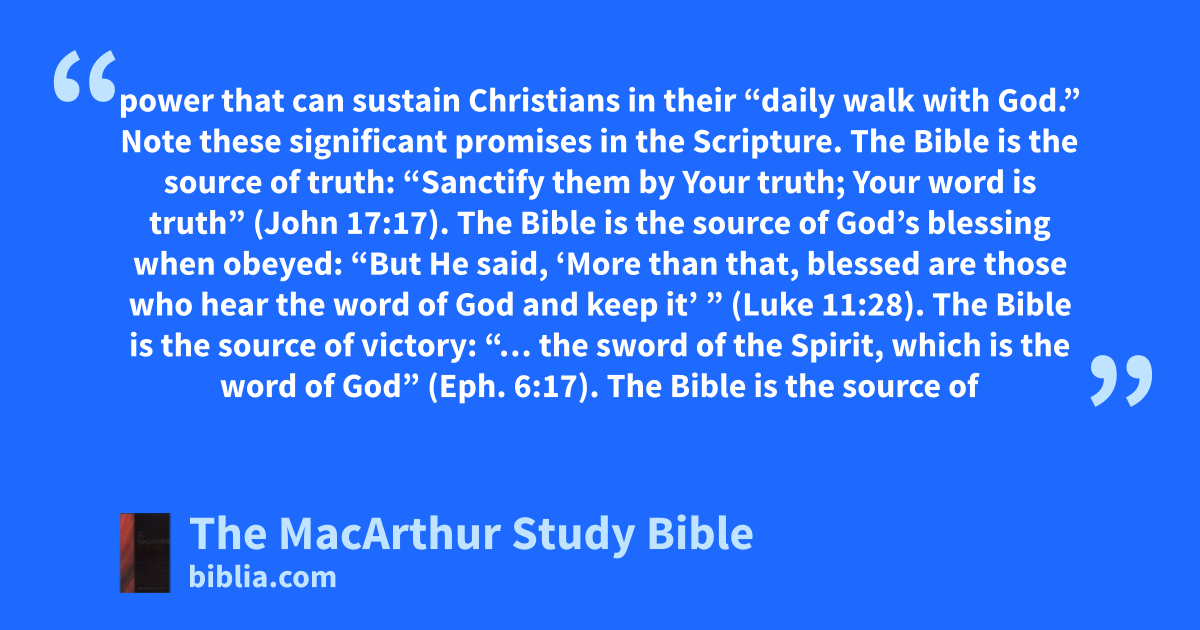 power that can sustain Christians in their “daily walk with God.” Note these significant promises in the Scripture. The Bible is the source of truth: “Sanctify them by Your truth; Your word is truth” (John 17:17). The Bible is the source of God’s blessing when obeyed: “But He said, ‘More than that, blessed are those who hear the word of God and keep it’ ” (Luke 11:28). The Bible is the source of victory: “… the sword of the Spirit, which is the word of God” (Eph. 6:17). The Bible is the source of