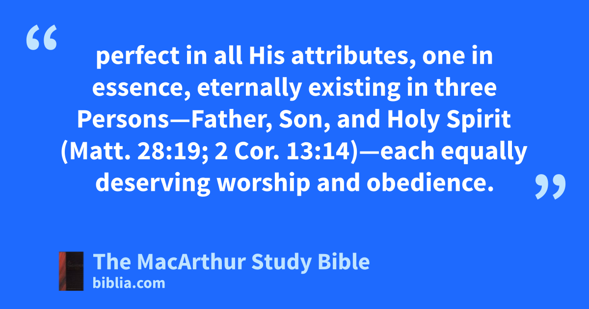 perfect in all His attributes, one in essence, eternally existing in three Persons—Father, Son, and Holy Spirit (Matt. 28:19; 2 Cor. 13:14)—each equally deserving worship and obedience.