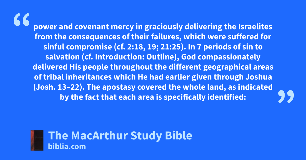 power and covenant mercy in graciously delivering the Israelites from the consequences of their failures, which were suffered for sinful compromise (cf. 2:18, 19; 21:25). In 7 periods of sin to salvation (cf. Introduction: Outline), God compassionately delivered His people throughout the different geographical areas of tribal inheritances which He had earlier given through Joshua (Josh. 13–22). The apostasy covered the whole land, as indicated by the fact that each area is specifically identified: