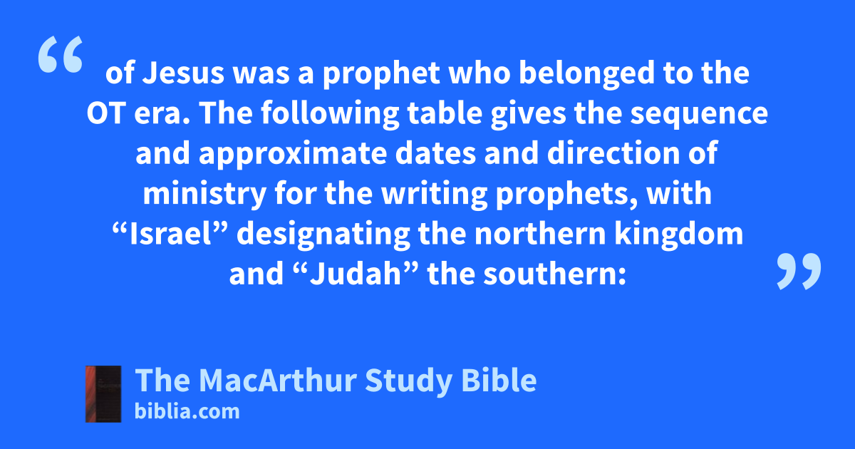 of Jesus was a prophet who belonged to the OT era. The following table gives the sequence and approximate dates and direction of ministry for the writing prophets, with “Israel” designating the northern kingdom and “Judah” the southern: