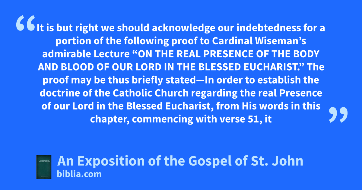 It is but right we should acknowledge our indebtedness for a portion of the following proof to Cardinal Wiseman’s admirable Lecture “ON THE REAL PRESENCE OF THE BODY AND BLOOD OF OUR LORD IN THE BLESSED EUCHARIST.” The proof may be thus briefly stated—In order to establish the doctrine of the Catholic Church regarding the real Presence of our Lord in the Blessed Eucharist, from His words in this chapter, commencing with verse 51, it