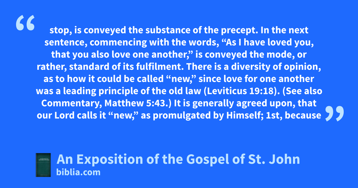 stop, is conveyed the substance of the precept. In the next sentence, commencing with the words, “As I have loved you, that you also love one another,” is conveyed the mode, or rather, standard of its fulfilment. There is a diversity of opinion, as to how it could be called “new,” since love for one another was a leading principle of the old law (Leviticus 19:18). (See also Commentary, Matthew 5:43.) It is generally agreed upon, that our Lord calls it “new,” as promulgated by Himself; 1st, because