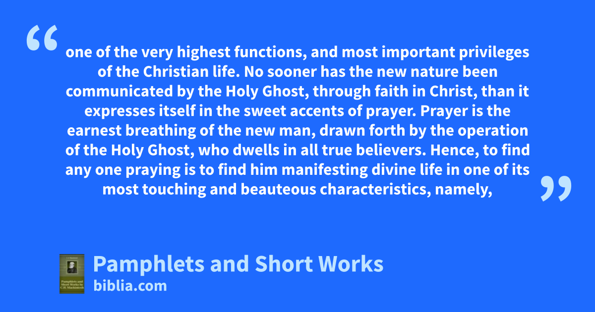 one of the very highest functions, and most important privileges of the Christian life. No sooner has the new nature been communicated by the Holy Ghost, through faith in Christ, than it expresses itself in the sweet accents of prayer. Prayer is the earnest breathing of the new man, drawn forth by the operation of the Holy Ghost, who dwells in all true believers. Hence, to find any one praying is to find him manifesting divine life in one of its most touching and beauteous characteristics, namely,