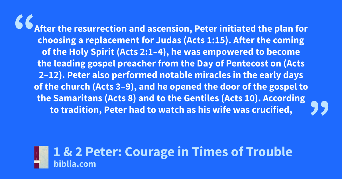 After the resurrection and ascension, Peter initiated the plan for choosing a replacement for Judas (Acts 1:15). After the coming of the Holy Spirit (Acts 2:1–4), he was empowered to become the leading gospel preacher from the Day of Pentecost on (Acts 2–12). Peter also performed notable miracles in the early days of the church (Acts 3–9), and he opened the door of the gospel to the Samaritans (Acts 8) and to the Gentiles (Acts 10). According to tradition, Peter had to watch as his wife was crucified,