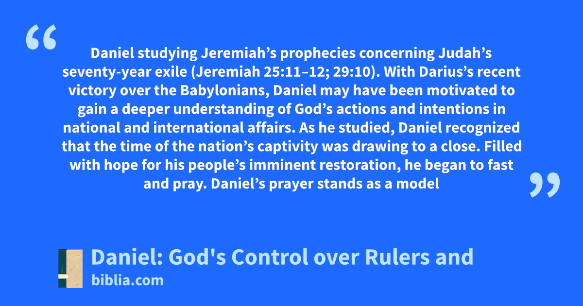 Daniel studying Jeremiah’s prophecies concerning Judah’s seventy-year exile (Jeremiah 25:11–12; 29:10). With Darius’s recent victory over the Babylonians, Daniel may have been motivated to gain a deeper understanding of God’s actions and intentions in national and international affairs. As he studied, Daniel recognized that the time of the nation’s captivity was drawing to a close. Filled with hope for his people’s imminent restoration, he began to fast and pray. Daniel’s prayer stands as a model