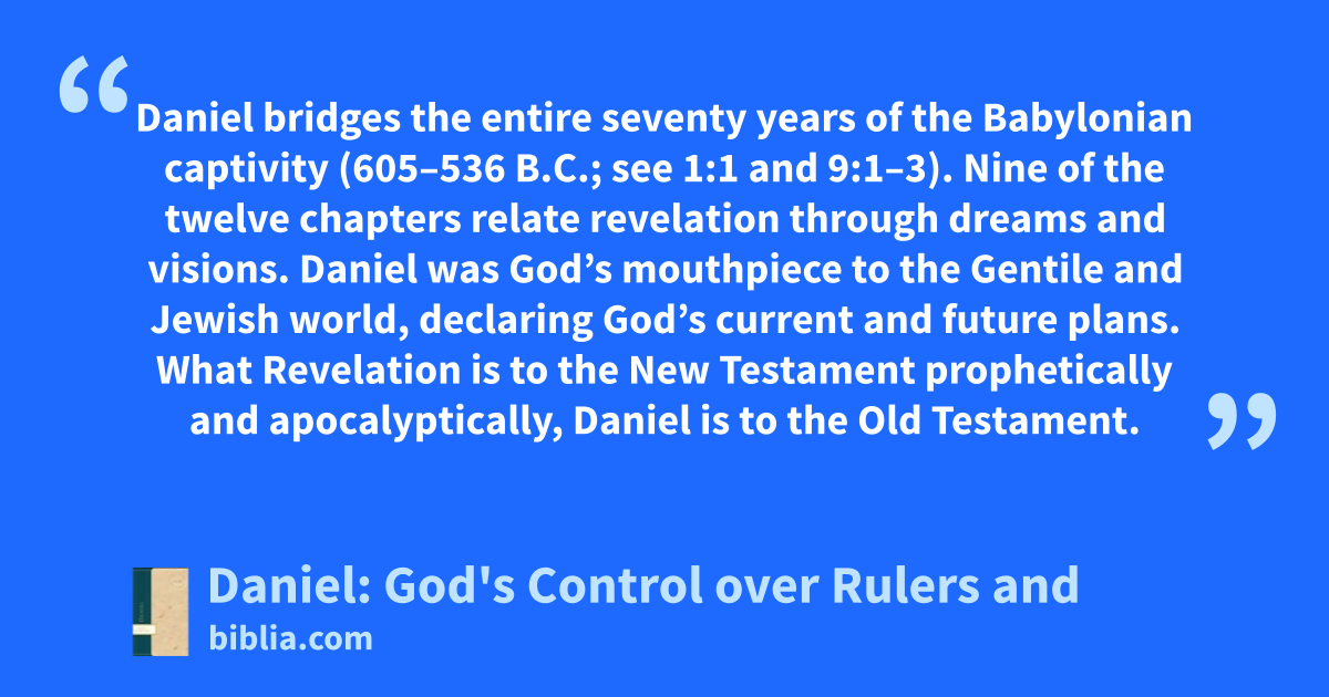 Daniel bridges the entire seventy years of the Babylonian captivity (605–536 B.C.; see 1:1 and 9:1–3). Nine of the twelve chapters relate revelation through dreams and visions. Daniel was God’s mouthpiece to the Gentile and Jewish world, declaring God’s current and future plans. What Revelation is to the New Testament prophetically and apocalyptically, Daniel is to the Old Testament.