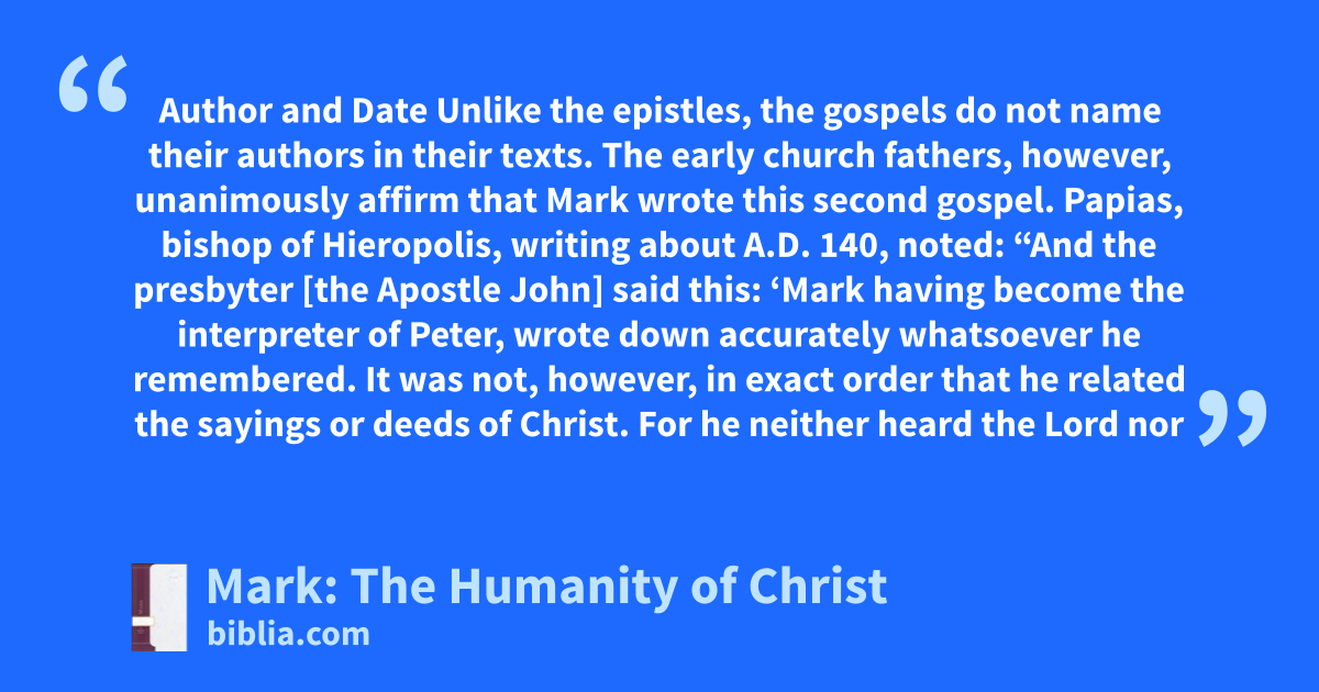 Author and Date Unlike the epistles, the gospels do not name their authors in their texts. The early church fathers, however, unanimously affirm that Mark wrote this second gospel. Papias, bishop of Hieropolis, writing about A.D. 140, noted: “And the presbyter [the Apostle John] said this: ‘Mark having become the interpreter of Peter, wrote down accurately whatsoever he remembered. It was not, however, in exact order that he related the sayings or deeds of Christ. For he neither heard the Lord nor