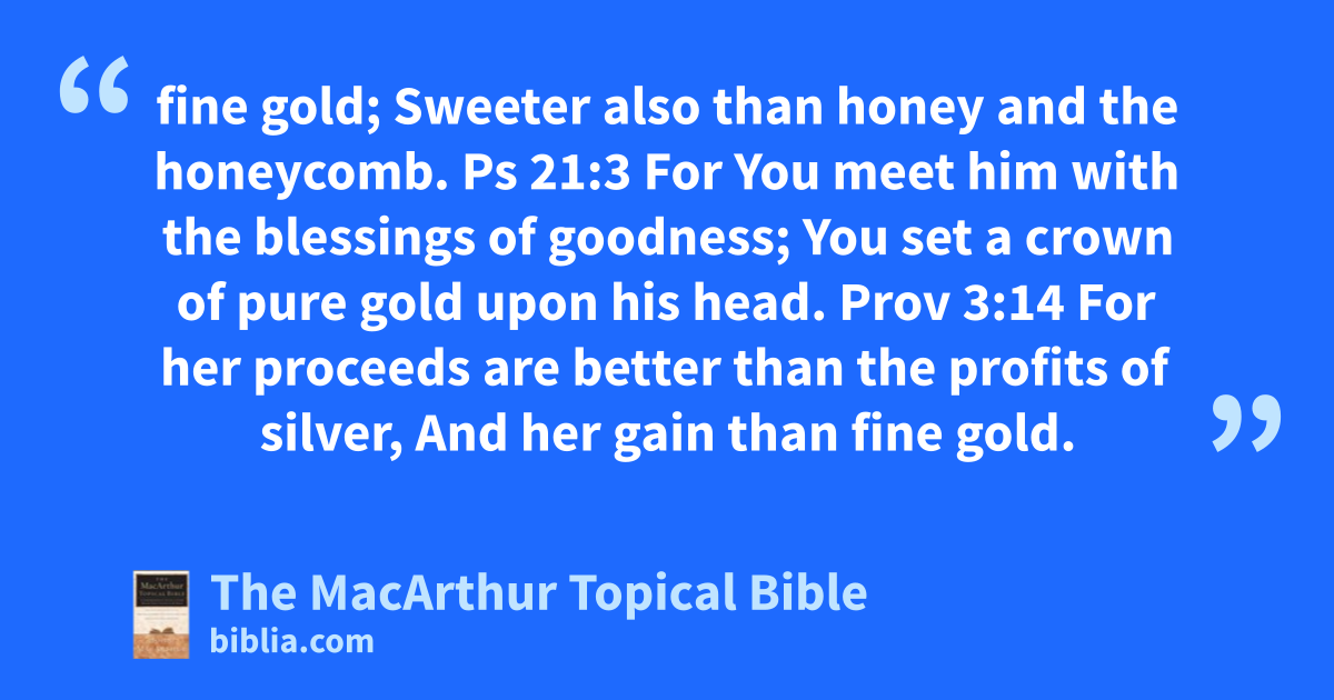 fine gold; Sweeter also than honey and the honeycomb. Ps 21:3 For You meet him with the blessings of goodness; You set a crown of pure gold upon his head. Prov 3:14 For her proceeds are better than the profits of silver, And her gain than fine gold.