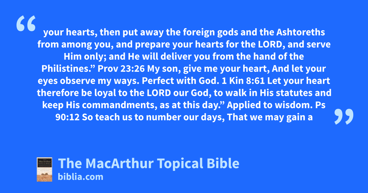 your hearts, then put away the foreign gods and the Ashtoreths from among you, and prepare your hearts for the LORD, and serve Him only; and He will deliver you from the hand of the Philistines.” Prov 23:26 My son, give me your heart, And let your eyes observe my ways. Perfect with God. 1 Kin 8:61 Let your heart therefore be loyal to the LORD our God, to walk in His statutes and keep His commandments, as at this day.” Applied to wisdom. Ps 90:12 So teach us to number our days, That we may gain a