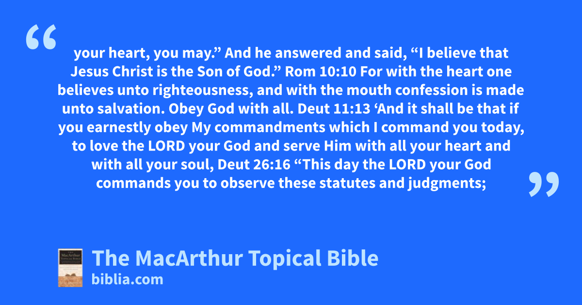 your heart, you may.” And he answered and said, “I believe that Jesus Christ is the Son of God.” Rom 10:10 For with the heart one believes unto righteousness, and with the mouth confession is made unto salvation. Obey God with all. Deut 11:13 ‘And it shall be that if you earnestly obey My commandments which I command you today, to love the LORD your God and serve Him with all your heart and with all your soul, Deut 26:16 “This day the LORD your God commands you to observe these statutes and judgments;