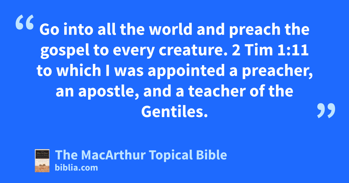 Go into all the world and preach the gospel to every creature. 2 Tim 1:11 to which I was appointed a preacher, an apostle, and a teacher of the Gentiles.