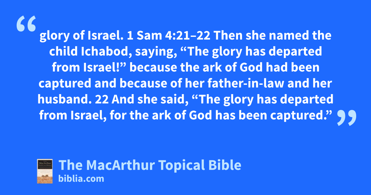 glory of Israel. 1 Sam 4:21–22 Then she named the child Ichabod, saying, “The glory has departed from Israel!” because the ark of God had been captured and because of her father-in-law and her husband. 22 And she said, “The glory has departed from Israel, for the ark of God has been captured.”