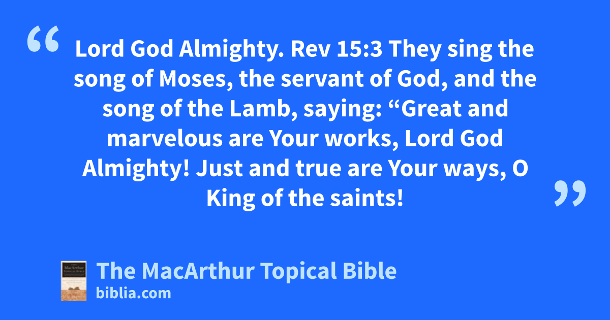 Lord God Almighty. Rev 15:3 They sing the song of Moses, the servant of God, and the song of the Lamb, saying: “Great and marvelous are Your works, Lord God Almighty! Just and true are Your ways, O King of the saints!