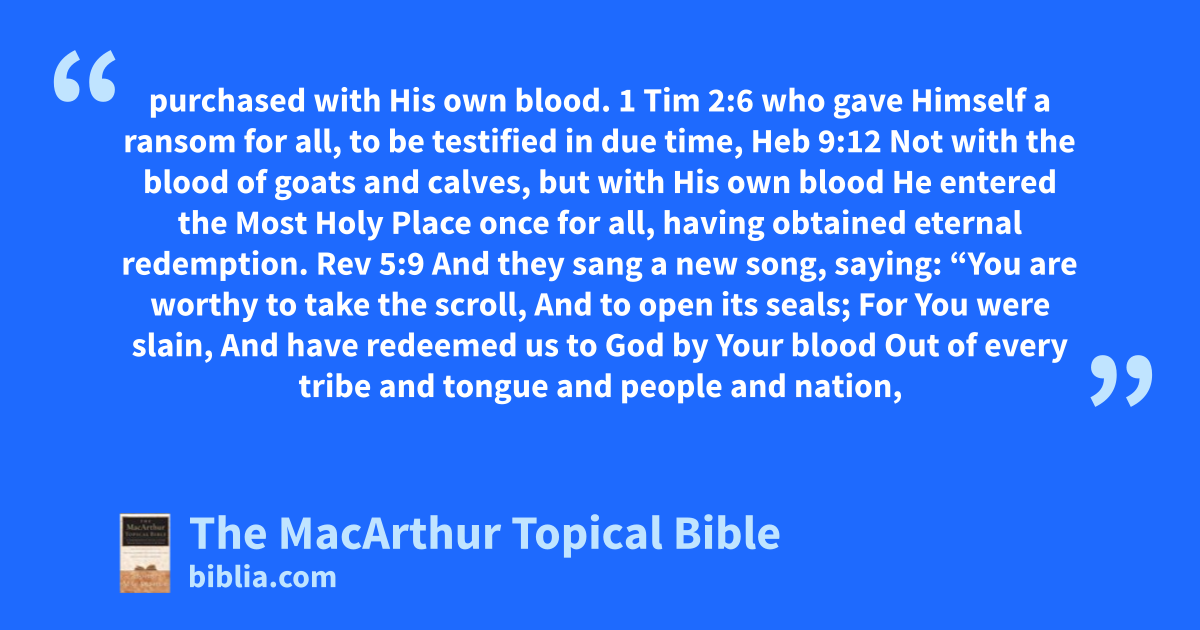 purchased with His own blood. 1 Tim 2:6 who gave Himself a ransom for all, to be testified in due time, Heb 9:12 Not with the blood of goats and calves, but with His own blood He entered the Most Holy Place once for all, having obtained eternal redemption. Rev 5:9 And they sang a new song, saying: “You are worthy to take the scroll, And to open its seals; For You were slain, And have redeemed us to God by Your blood Out of every tribe and tongue and people and nation,