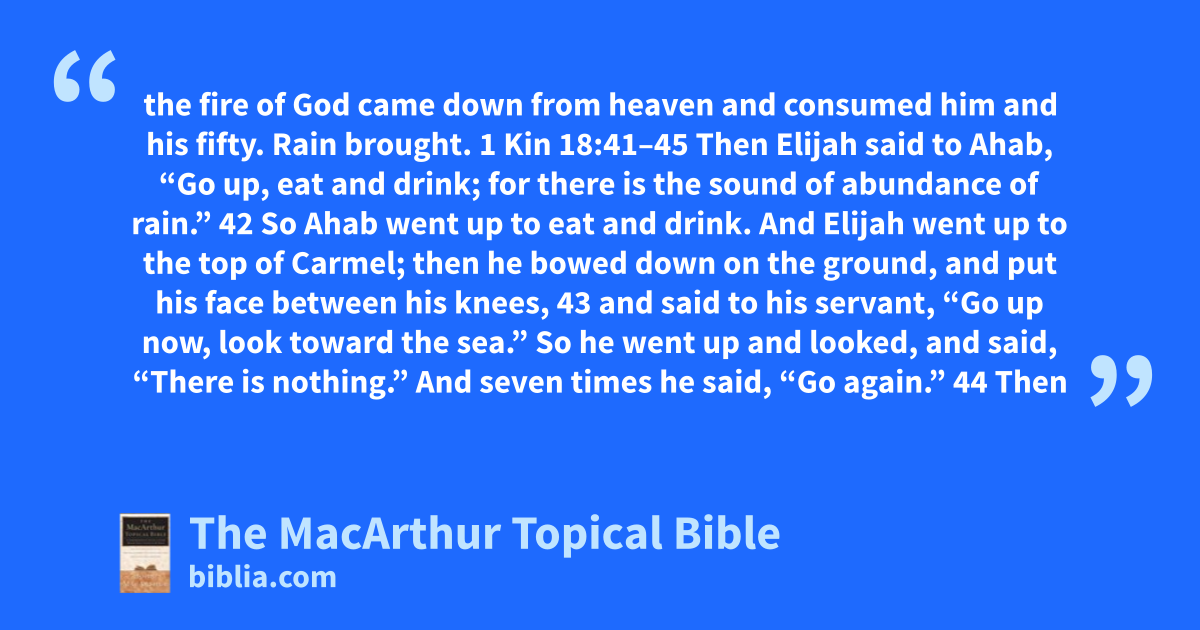 the fire of God came down from heaven and consumed him and his fifty. Rain brought. 1 Kin 18:41–45 Then Elijah said to Ahab, “Go up, eat and drink; for there is the sound of abundance of rain.” 42 So Ahab went up to eat and drink. And Elijah went up to the top of Carmel; then he bowed down on the ground, and put his face between his knees, 43 and said to his servant, “Go up now, look toward the sea.” So he went up and looked, and said, “There is nothing.” And seven times he said, “Go again.” 44 Then
